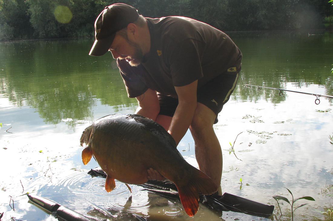 As the fish reached its first weed bed the pressure was maintained and the rod did all the work to tease it from the onion weed that adorns the middle of the lake. Within a few more minutes, it was within netting range and a short wade up to my knees later, it was safely engulfed and awaiting inspection. After a quick fin check, it was lifted onto the mat, secured in the sling and placed back into the deep margins to gather its thoughts and reflect upon the mistake it had made. This also gave me time to arrange the photographers, mats and other trophy shot equipment. Thankfully my wife Rebecca and also my friend Mark had popped down to see me, and had witnessed the entire affair, from casting out to landing the carp.