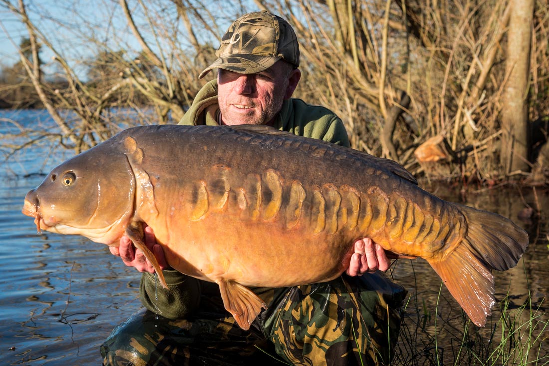 The next take came about 30 minutes after slipping the last fish back and straight away it felt much bigger than the rest of the fish. It was stripping line right from the off and flat rodded me as I tried to slow it down. It took me up and down the deep channel in front of me and kept deep as it got close in desperately trying to get into the snags to my right. I piled on the pressure and a glorious scaley flank rolled just beyond the net. Dan was holding the net and I think we swore in unison as it dived under the net and back towards the snags. Once again I piled on the pressure and this time it popped up and time stood still as it wallowed on the surface waiting to be netted. I was blown away, this was a special fish, with big apple slice scales along it’s flanks and glorious winter colours this was a perfect way to end the day. The afternoon sun was low and golden as we took the pictures and the fish looked amazing as I held it up for the camera. At 42lb 8oz Dan confirmed it was a new lake record, a fish known as the Half Lin. I was on cloud nine, one of the best looking fish I’ve ever caught.