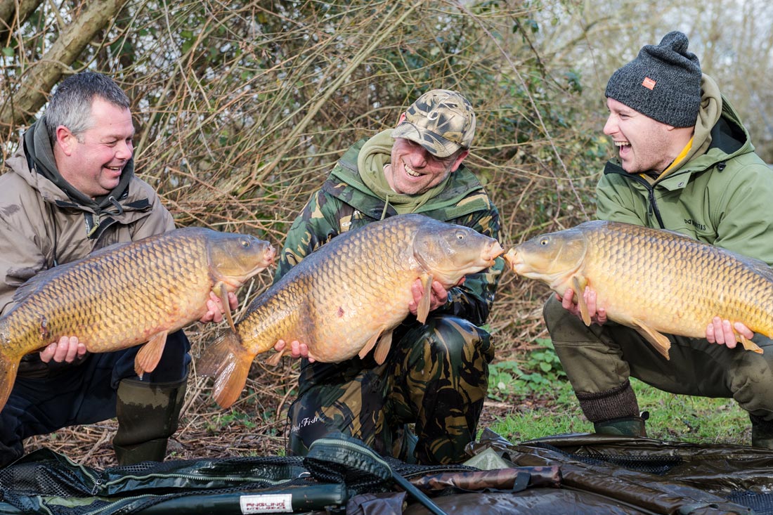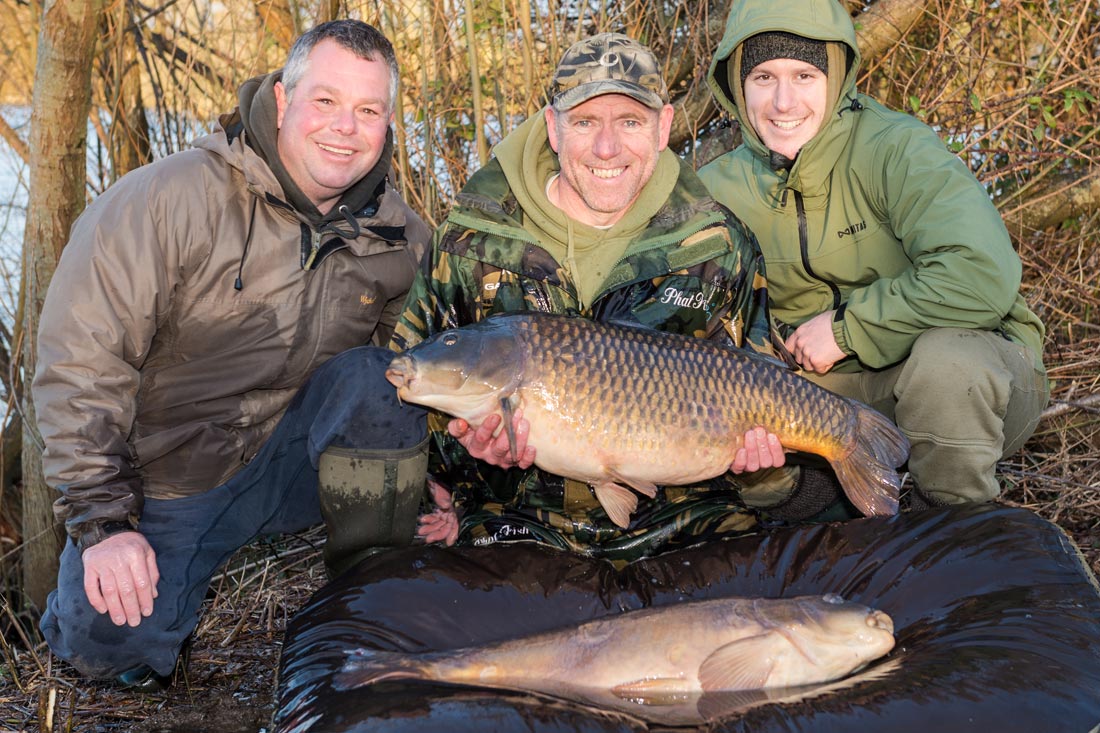 I topped up the spot again after about an hour, shortly after this the liners started again and within 30 minutes the first of three in a row tore off. This one felt much livelier than the others and was darting about all over the swim, soon enough a 21lb common was in the net. Again the first job was to get back on the spot, so whilst Dan sorted the fish out I cast it back out and started to put some bait out. As the second Spomb hit the water the recast rod pulled round. Adam grabbed my spod rod as I picked up the right hand rod. The fish stayed deep and plodded around in the margin before kiting towards the bay on my left and eventually a deep bodied common of 27lb rolled over the net cord. I really could believe it, another brace, or so I thought. We got the second common sorted and rod back on the spot, set the mat and camera up ready for the shots. I was holding up the bigger common for the first picture when the alarm started howling and I was away again! The lads sorted the common out and raced along the mud slipping and sliding my way to the third take in short succession. After a short scrap another 21lb common was in the net.