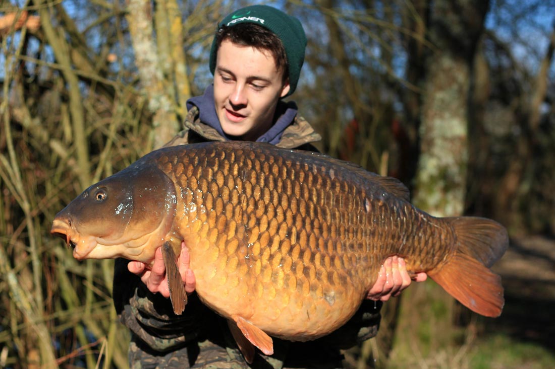 At around 5am my middle rod was away. I quickly got my shoes on and picked up the rod! It charged around stripping line, so I just let it tire itself out. As it came into the margins it tried to reach the snags to my right and take out one of my other lines, but I soon had it under control and I guided it over the waiting net. I could see it was one of the big commons, so I quickly zeroed the sling and scales and got her on the mat to be weighed! She went 40lb 8oz! A new PB common and on a 12 foot zig! I couldn’t believe my eyes, buzzing was by far an understatement.