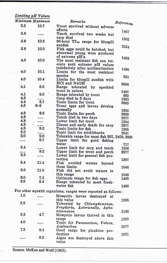 ‘Below a pH of 5.0, mortality occurs in some life stages of certain fish species, although some fishes can be acclimated to pH levels below 4.0. Certain species of macroinvertebrates can tolerate very low pH values. Lackey (1938) found Gammarus spp. in two streams with pH values of 2.2 and 3.2, mosquito larvae in a stream at pH 2.4, and caddis fly larvae (Trichoptera) at pH 2.4. Nevertheless, the primary productivity of freshwater aquatic ecosystems is reduced considerably below pH 5.0, which, in turn, reduces the food supply for higher organisms. Hence, fish that remain present would likely experience reduced numbers and/or growth rates (Alabaster and Lloyd 1980).’