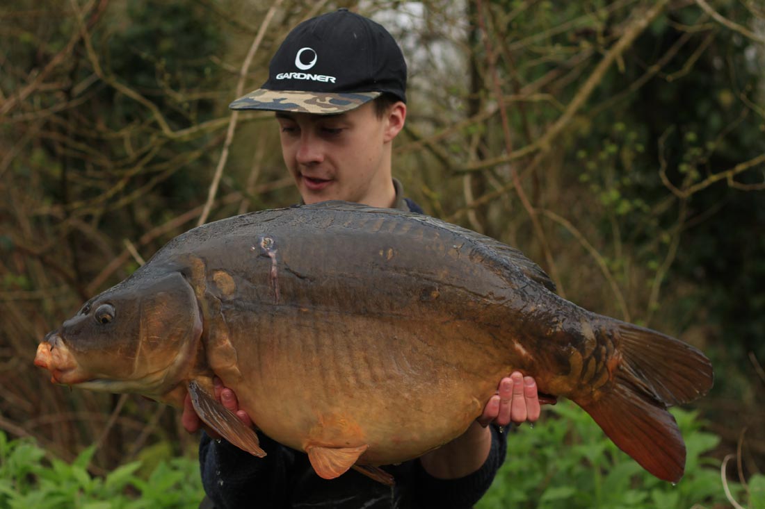 I played this fish in for a long time and it was clear to see the fish had no thoughts on giving up. It bolted around the margins for a good 10 minutes before it was in the back of my net. I recognised the fish as it was stunning and knew it was the one called The Mug and was around the mid-thirty pound mark. I was buzzing to say the least! I quickly got a few things ready, so I could unhook it and get the rod back out but I was inturupted by my left hand rod absolutely screaming off! As soon as I picked the rod up it went on a mad one stripping 40 yards off of my spool in about 60 seconds! After an epic battle I carefully slipped the net under it, trying my best to not let the first one escape!