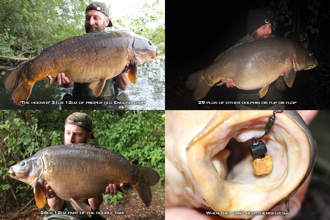 Thursday morning began with a early morning wakeup call from a immaculate 27lb 6oz common, which little did I know was going to become a regular visitor to me. At 8.30am Big Lee and I we’re having a brew and putting the world to rights, when the middle rod signalled a take. This resulted in a big boat battle and landing the fish two swims up, which turned out to be a 26lb 6oz mirror. I moored the boat up and went to get my unhooking mat and accessories from my swim. When I walked into the swim I was greeted by the hanger on my left rod buried into my buzzer and the rod hooped round. I ran back to the boat, secured the fish in the margins, stole my pals net and set sail again. After another long deep battle in the weed my net was soon filled with a low thirty original. The fish turned out to be the very sought after ‘Hoover’ weighing 31lb 12oz. What a carp and potentially 45 years old. I took some pictures and returned both fish. A brew was well needed.