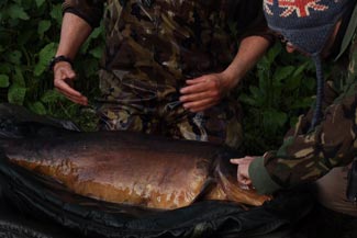 I quickly staked out the net and then grabbed a torch. Once I carefully lit up my prize I could see it was a long dark mirror but on quick inspection I couldn’t make out which one because I couldn’t make out the scales I needed to see. Thinking it might be the long fish which could be around 40lb I let it be in the net and ran to my car to grab my big scales. Once everything was zeroed and the scales were tied to a tree I got the fish out and onto the mat. As I laid it down I straight away saw the scales I was looking for and realisation set in. I’d caught him, Baby Black. My target was there in front of me on my mat. Being as I was on my own I quickly weighed him then made a few phone calls to Tom Stokes, Chris Gardner and Byron who were fishing on Burghfield. They were only too happy to come over and help out with the photos and so was Young Joe, Sam and Scott Lloyd. Words cannot describe how much of a stunner this fish is and the pictures do not do it justice. You have to actually see it on the bank to appreciate it and this is up there with some of my past captures like Bazil etc. Quite possibly one of the best carp around at the moment…
