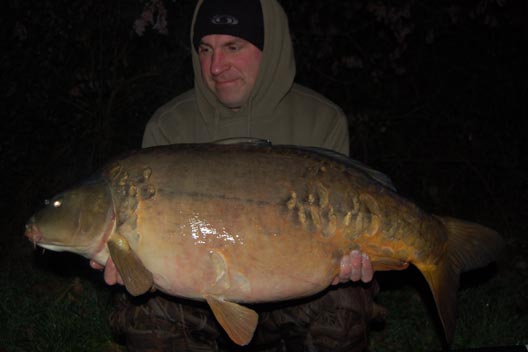After safely retaining the fish and whilst assembling all the essentials needed to safely deal with her on the bank, I then galloped up the bank to the ardent Chelsea fan, Micky, who was fast asleep (?!). Remarkably, I managed to wake him up and get him to do the honours with the camera. With me trying to understand quite how a black piece of foam nailed the magnificent fish, we both admired a stunning 33lb 8oz broken linear. The night pictures can never do it justice, but we knew that we were looking at a really lovely carp.