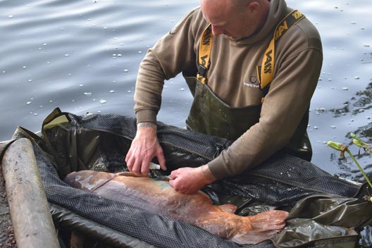 Later that week I managed to get another overnighter in and I decided to try a new area of the lake that I hadn’t fished known as Bramble Bay. I initially put a single rod out towards some fizzers but after an hour had passed the fizzing stopped. I decided to move to the opposite side of the bay and have a quick lead about with my new GT Application Rod. I soon located a glass like silty area in what I guessed to be around 5 feet of water. A new wind was pumping in and the conditions looked incredible, so I decided to give it a good hit of 12mm and 18mm Chocomino boilies. The day and night passed quietly but I was confident of a bite from the silt patch and sure enough my middle rod was away the following morning. After a short but heavy fight a real old character rolled over the net cord. It turned about to be a historic Welly carp named Lumpy, which weighed at 44lb and luckily for me Leon Bartropp was on hand to take some cracking snaps.