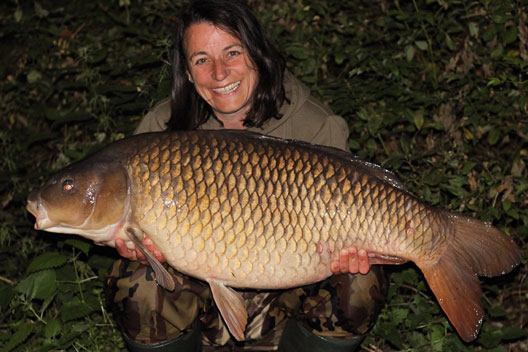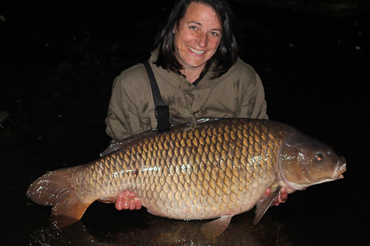 The fight was slow and steady with the fish staying deep. The fish took a bit of line on solid runs that I wasn’t going to even try and stop, even if I could. I gained a bit of ground before it took off again. As the fight drew nearer to the bank, I lowered my other two rods to get them out of the way and after one final burst I slid the net under the fish before taking a look inside. There laid a good sized common, quite a long fish which I guessed to be around the mid to upper thirty mark. While the fish was safely resting in the net, I got the mat out, wet the sling and zeroed the scales. After filling a bucket with water and getting everything ready, I got my waders on to get the fish out of the water. I rolled the net down, checked the pecks were flat and started to lift the fish out. It was heavy, much heavier than I had expected! I placed it on the mat and took the hook out before putting it in the sling. I lifted it onto the scales which were on the weighing station behind me and the needle swung around to bounce between 45 and 46. I was so surprised I looked down to check I wasn’t standing on the cord. I lifted it off the scales and put it back on. Again, the needle swung round to the same place. It settled on 45lb 7oz and now I had the dilemma of what fish it was. There were only a few fish it could be and one of which I’d had before, so I put the fish back on the mat and took another look. I checked for any distinguishing marks and realised I had one of the big commons known as One Barb, a fish I had not had before. I quickly zipped up the retainer and placed him back in the water before sitting down for a second to calm myself down. Buzzing wasn’t the word, I was absolutely ecstatic!