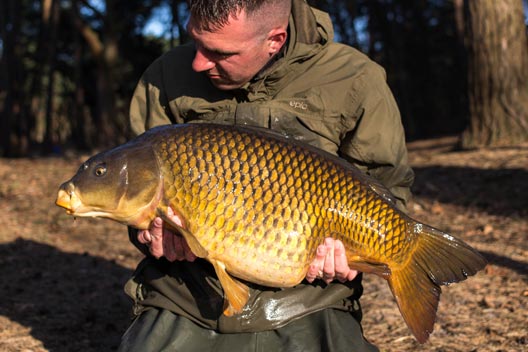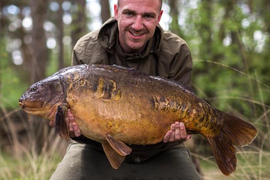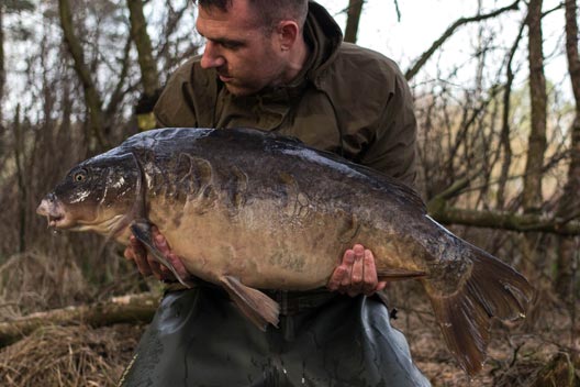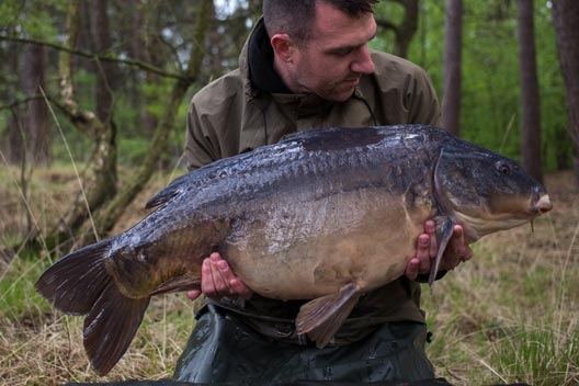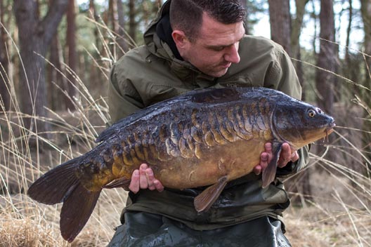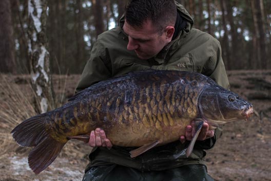 Deze schub van vorm als big heeft flink van de bollies gegeten flink wat resten worden er achter gelaten op de mat. eigenlijk weet ik niet wat ik mee maak ik heb nu 5 vissen gevangen waarvan 3 van de categorie extreem zijn. ik heb de schub net terug gezet en meteen krijg ik weer een beet maar deze keer op de anderen hengel ik trek de vis bij de takken weg en even later bewonder ik weer een schub op de mat wel van iets kleiner formaat. Wel een karakter vis een met een kromme staart en daardoor weer bijzonder van zijn eigen. Me dag is compleet en ik besluit dan ook weer terug te gaan naar huis. Onderweg ben ik dan ook met mij gedachte weer bij de het water over een paar dagen zie ik de kans dan ook om er weer naar toe te gaan en in de tussentijd wordt er tot 2 keer toe weer wat voer verspreid het water begint een beetje op te warmen en besluit dan ook de hoeveelheid voer wat meer optevoeren. Ook de sector waar ik voer achter laat word wat meer vergroot met de gedachte de vissen wat meer te laten moeten zoeken en ze wat meer te laten zwemmen. Ik ben van mening dat ik dan tijdens het vissen de vissen sneller moet kunnen haken door dat ze in beweging zullen blijven en moeten zwemmen van het ene stukje voer naar het anderen. Helaas draait deze dag uit op een blank en ik ben bang dat ik teveel heb gevoerd in de dagen hiervoor tijdens het vissen heb ik minimaal bijgevoerd en besluit dan ook om geen voer achter te laten en de volgende dag terug te keren. Bij aankomst kan het niet slechter beginnen en kom ik er achter dat ik mijn steunen de dag ervoor heb laten staan, het verbaast mij eigenlijk ook dat deze weg is omdat ik er nauwelijks iemand tegen kom toch heeft een opletten voor bij ganger gebruik gemaakt van mijn niet oplettende gedrag en deze in zijn zak gestoken. Dit is geen reden om naar huis te gaan en er zal gevist gaan worden de hengel bij de obstakels wordt op een beetmelder gelegd en op de andere zal ik extra moeten letten. Ergens met een stuk gevonden veter in de struiken creëer ik een hanger zodat ik toch nog elke centimeter die er aan de lijn wordt getrokken kan opmerken. Mijn vertrouwen is dan ook niet meer zo hoog als het al heel de ochtend stil is half in slaap hoor ik ineens het tikken van een molen slip en besef dat ik beet heb de lijn word van de molen gerukt en de vis weet wat hij wil ook duikt hij de diepte in rustig verplaats het gevaarte zich van links naar rechts beetje bij beetje win ik meer meters als hij en bij de kant zie ik door polaroid een paar flinke schubben op zijn flank. Ook onder de kant weet hij van geen ophouden en blijft maar rondjes draaien ik wacht op het moment dat hij met zijn bek boven komt en pak deze kans ik duw het net eronder en trek het meteen omhoog. Meteen vallen mijn ogen op een oude karakter spiegel , het voorjaar moet nog beginnen en ik heb al een aantal parels in mijn logboek kunnen noteren.