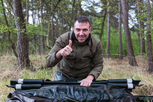 Helaas blijft het bij deze ene vangst maar tevreden worden de spullen op de kar geladen en duw deze door het losliggende zand bulten en kuilen terug naar de auto. Onderweg kom ik de oude man tegen die mij vertelde over de dood van de grote spiegel en hij vraagt dan ook of ik wat heb kunnen vangen tijdens het druppen van de natte onthaak mat word er stug nee gezegd en loop door. Later in de volgende week zal ik er weer een dag heen rijden en besluit in het donker al aan het water te zijn rustig benader ik de stek en voer weer niet teveel bij ik heb niet veel tijd en ga dan ook voor een snelle aanbeet. Dit blijkt te werken als ik al binnen een uur de eerste vis mag laden dit is ook niet de laatste van de ochtend en verwelkom 3 vissen op het droge een vis word er verspeelt in de obstakels en besluit om de hoeveelheid voer weer wat meer op te schroeven ook tijdens de volgende sessie voer ik meer bij en hoop zo weer een betere vis te kunnen vangen ik hoop dat de wat kleinere hongerige vissen de stek snel zullen verlaten en de grotere vissen wat langer blijven door eten. Al snel komt de eerste beet en merk dat deze weer het diepe in schiet al de anderen betere vissen deden dat ook en eigenlijk sta ik een beetje met knikkende knieën te drillen vol gas blijft het alles geven maar toch trekt hij aan het korstte eind en ligt hij op de mat. even word de vis in de sling gehangen en nadat de hengel weer is voorzien van een nieuwe rig en terug op de plek ligt word de camera uit de tas getrokken en op het statief neergezet hij blijft automatisch door rammelen en een aantal foto’s worden voor altijd op het netvlies gebrand. Een oude karakter spiegel die misschien al wel net zo oud is als mijn zelf.