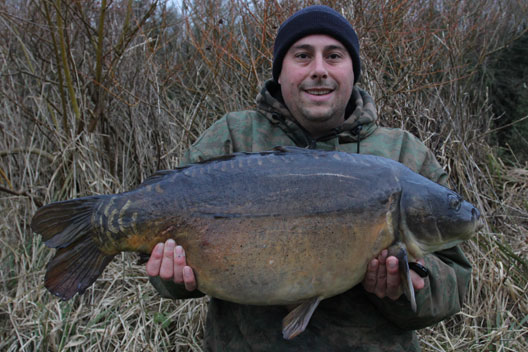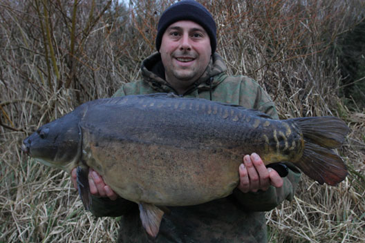 Throughout January and February when the barbel were not playing ball I decided to fish for carp again, and what better place to start than in the swim I was fishing earlier in the year. After a bit of pre baiting I made the odd trip down during the first couple of weeks in January catching a few mirrors and commons around the mid double mark. Then after an accident at work resulting in my wrist being in a splint for two weeks, I decided to have a go knowing it was probably not the best of ideas. I plotted up for the afternoon in the stones and while having a sandwich my downstream rod burst into life. After a slow heavy fight I landed a largish mirror which I recognised to be one I had caught in the summer at 21lb. She was weighed and a few pictures taken with me struggling to hold her properly with my damaged wrist and the metal splint stopping me bending my wrist. She weighed 23lb 4oz and some self takes were taken of a new PB river carp.