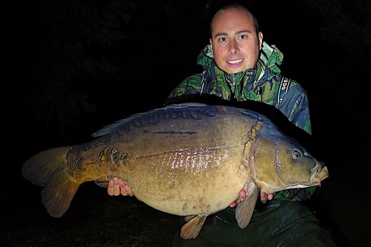 The middle of March to the end of May was spent fishing the club water where there was not a great deal to report other than me losing an upper 20 common about a rod length from the net. On another trip I was fishing a huge swim where a few fish were showing in front of me all over the place, a pocket of them were well beyond my fishing distance and to the left of the swim. I spotted a mate on the pub bank and later got a call from him! ‘Fancy a social mate?’ Being one of the biggest casters on the pond I knew his game… I allowed Pryor to double up to the left of the swim putting him on the edge of some of the fish we had seen in the abbis. At around 11pm Pryor had a steady take on one of his rods at over 190 yards out. I put on the waders and got the net ready, it would be some time though before the fish was ready but when it was it went in the net for the first time. I flicked the head torch on and there was a huge fish in the net – like massive! Pryor got his kit ready and we weighed the fish at 54lb 8oz, a great bit of angling. I could not have been happier for him even if he wiped out two of my rods in the process.