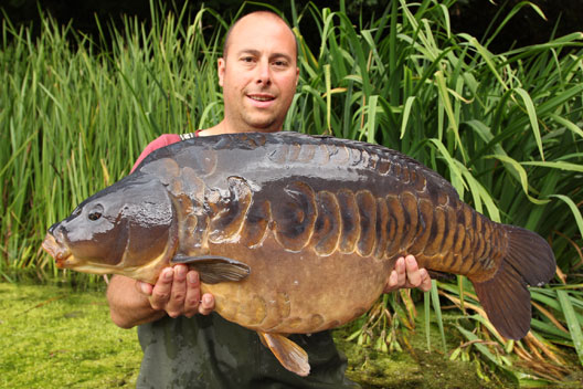 After work on Tuesday 27th I headed back down for two nights, I had two bites on Wednesday morning and lost both of them due to hook pulls. I had lost a few by now due to one thing or another and two loses in the morning made me sick. Thursday morning was better with me landing a 31lb 2oz mirror at 1am and then losing a fish at around 4.45am. The rod was back out when at 7.30am I had another bite resulting in a 33lb 4oz linear. At around 9.30am I was having a bacon sandwich and a tea when I had a bite on my right hand rod. As I made my way to it my left hand rod took off as well! Both fish weeded me good and proper and I had to go out in the boat to land them. Both fish weighed 29lb 8oz and the previous losses were all but forgotten!