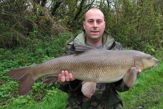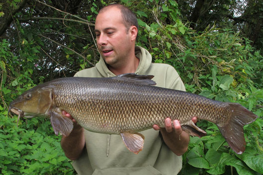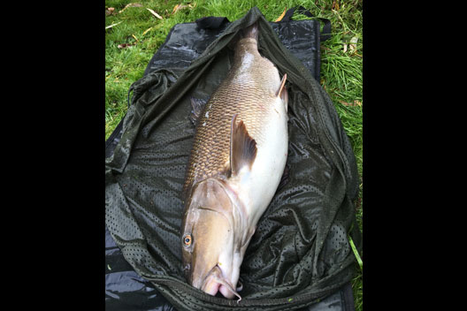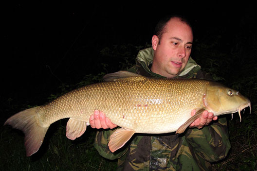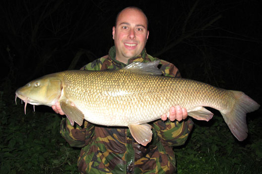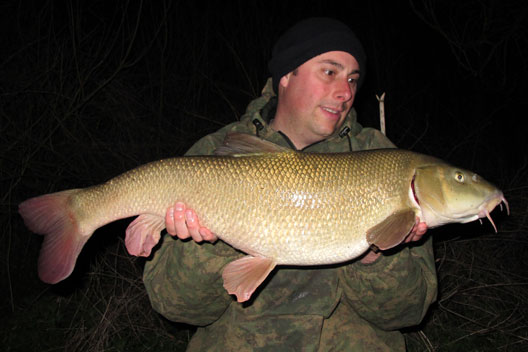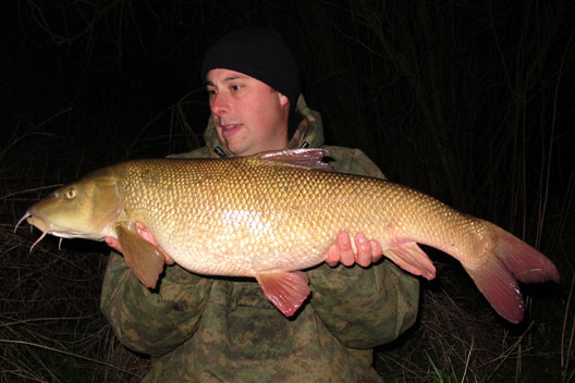 On Thursday 31st I headed back to the swim on the river I had fished the previous week. I arrived late morning and within 30 mins I had a barbel bite, which felt like a good fish – slow and heavy in the high water. I landed what I thought was another 15lb Barbel so I got the self take kit and scales ready and weighed it at 15lb 6oz, it was another new PB. I was over the moon, so I did the photos and cast back out then made a call to a couple of mates. During the afternoon I had another three barbel all between 5 and 8lb. At about 7pm I had a further bite, this was something else as the sheer power of the fish was unreal – so slow and strong line was being pulled from the clutch as I tried pulling it off the bottom. I landed what looked to be a huge fish, I flicked the head torch on and it was massive! I made a few phone calls and Rusty agreed to come down the muddy wet river and bought his missis in tow. He asked how big it was and I just said huge – purely because I had not weighed it! I sorted some bits out before weighing the barbel and the needle span round to 16lb 4oz. I rested the barbel in the net untill Rusty arrived and he took some shots and we let it go into the flooded river. That night I popped round Wiggys on the way home for a few teas and I soon convinced him that he should go down the river in the morning. Friday Myself and Wiggy went down for the day and I tried to persuade him to go in the swim I was in the day before but he was having none of it! That afternoon I landed another big barbel, this one being 14lb 12oz. Wiggy did the photos and I continued to persuade him to set up in the swim I was in but it was landing on deaf ears. The rest of the day and evening was quiet for both of us.
