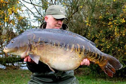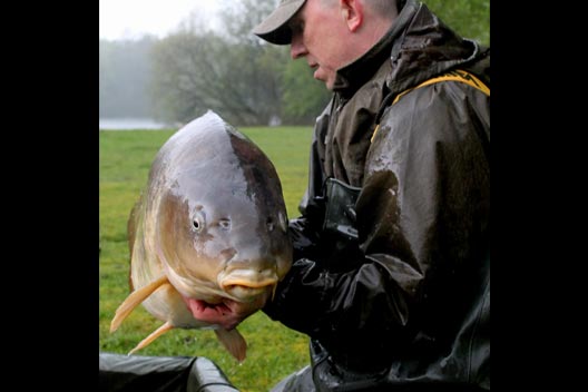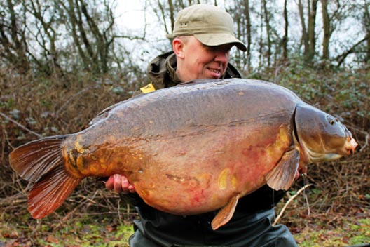 After a chilly 3-degree night, I woke at 5am to a liner on the left-hand rod, but it was the right-hand bobbin that lifted a couple of inches three quarters of an hour later. Then it dropped right back! That saw me surface from my sleeping bag and scurry towards the rods. As soon as the bobbin lifted one more inch, I reeled down into what was evidently a decent fish. A short, wintery battle was soon won and a shine of the torch down into the landing net unveiling one of the most sought-after gems, in the shape of the ‘Pretty Mirror’ at 49lb! With the fish safely secured in a retainer, a few texts were exchanged and I was soon holding up the magnificent fish in all its winter glory. Wow, simply lovely and more than I ever expected!