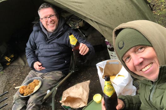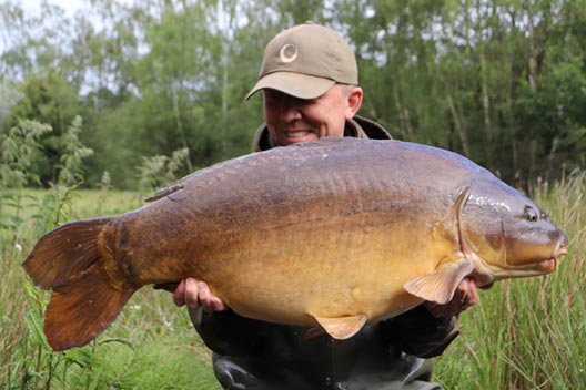Over the course of the next couple of days, I said my goodbyes to the steady stream of anglers popping in and a mega curry was consumed. The lake did throw up a couple of fish in those last few nights, but it wasn’t as prolific as we all hoped. With only two hours to go and after my left-hand rod had been on that spot for 44hrs, the bobbin pulled up the inch in to the mouth of the alarm and I was away. It was a really lovely way to finish, catching a pristine up and coming chestnut looking mirror, with the typical love heart tail that went 38lb.