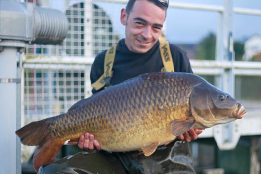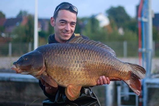 Het is ondertussen 22u s’avonds, aardedonker, en stiekem geniet ik wel van deze hele onderneming. Het gevoel ergens exclusief een stukje water te kunnen bevissen waarvan ik geen flauw benul heb van het bestand en de rillingen die over je rug lopen wanneer je al sluipend naar je stek wandelt, maken dit hele gevoel compleet. Beide hengels worden voorzien van ronnie-rigs, en een klein pva’tje met gebroken livekes ( 12m livesystems.) De ene hengel wordt tegen een kademuur gepositioneerd, de andere verdwijnt onder de boeg van een plezierjacht.De brolly wordt op de laagste stand gezet, en al gauw staat er een pruttelende bialetti voor men neus, genieten. Rond 3u s’morgens wordt ik gewekt door een schreeuwende att. De vis neemt instant enkele tientallen meters lijn en de vis zwemt van tegen de kademuur recht onder een hele rij plezierjachten. Met knikkende knieen en veel vertrouwen in de 35lb hydrotuff weet ik na enkele minuten het net onder een machtig mooie schub te steken. Met een 17,2 kg zeker niet slecht als eerste vis op dit nieuwe stuk. Al snel breng ik de hengel weer in positie en groot is mijn verbazing als dezelfde hengel weer afloopt na amper een half uurtje. Na wat een identieke kopie lijkt van de eerste drill kan ik ook nu weer deze verzilveren en na weging blijkt deze vis 17,6 kg te wegen. Eerste korte nachtje en meteen 2 goeie dertigers, het kan slechter.Ondertussen is het 5u s’morgens en veiligheidshalve plooi ik men materiaal samen, volg alweer het smalle paadje over het sluisje, ga achter men auto, daar ik zeker niet wil worden ontdekt door een of andere alerte sluiswachter. Beide vissen worden op de gevoelige plaat gezet en moe maar geheel voldaan keer ik huiswaarts.