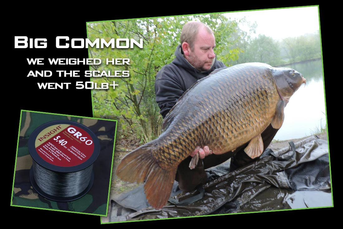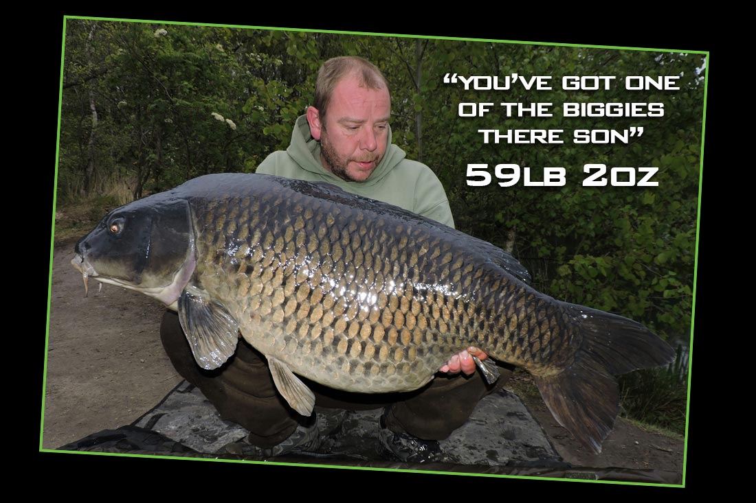 When dawn broke and it was time to get her out to weigh and photograph, I couldn’t even lift it out of the water! Naturally, I thought it was somehow snagged on the bottom somehow so again called my mate over, his time to help lift it out the water with me. Taking the strain, we both lifted and up it came. It was bloody massive! We put the common on the mat and Carl said to me “you’ve got one of the biggies there son”. Anyway, after the weighing she went 59lb 2oz – to say I was blown away doesn’t come near. Two amazing 50lb commons in 24hrs is shocking!