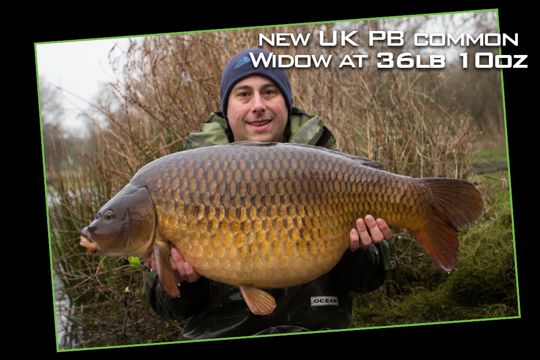 Saturday morning was quiet, until around mid-day when I had a screaming take from the 30 zone! Wiggy heard the bite and strolled round just in time to net a good common along with loads of weed. It was not until we removed the weed that I realized that the common in the net was probably the biggest in the pond. I rang Wayne who was at home and told him I had a mid-30 common in the net and he said he would stroll down. Whilst Wiggy and I waited for Wayne to arrive we had a cup of tea and got the kit ready. We weighed the common, named The Widow at 36lb 10oz. This was a new UK PB common for me and I was over the moon.