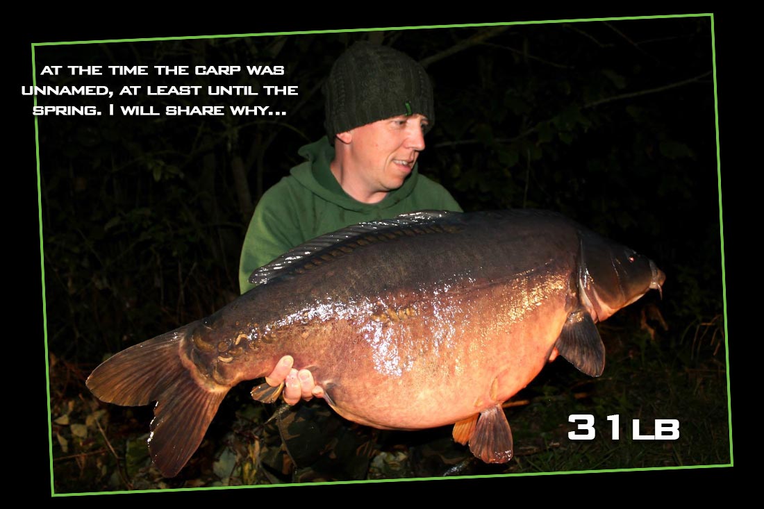 I recall working a particular spot, that had a large heavy plastic tube left behind [embedded in the lakebed or lying on th lake bed?] from when the lake was dug. I would deposit kilos of mixed pellets, chopped boilies, sweetcorn, hemp with tinned tuna fish added every couple of days around this tube. It was the 3rd October 2013, and I had landed a couple of carp during my previous trip, a couple of very wet at the end of September, when I caught the lakes first 30lb carp. Weighed at 31lb on the nose, at the time the carp was unnamed, at least until the spring. I will share why…
