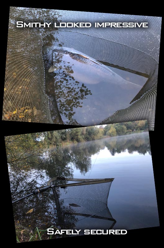 The capture of ‘Smithy’ was almost textbook carp fishing from start to finish. I woke early, whilst it was still dark. It had been mildly moist in the night, but not nearly as wet as the night before. I made a very early coffee and sat watching the light lift from the eastern corner of the lake. The birds build to full dawn-chorus song, and the morning mist was rolling across the surface of the lake from left to right. It felt bang on for a bite, despite the Bug indicators only twitching with the odd liner during the 36 hours so far. However, literally, while I was sat looking at the rods, the right-hand indicator lifted aggressively, but then stopped at the top. Then slowly, the line clicked out of the line clip and line started being drawn off the spool on click at a time. With the lake being so deep, when battle commenced the fish remained down deep for several minutes. I knew this was one of the good ones, but clearly I didn’t know which one it was. When it did eventually roll over the net cord, I knew instantly. In fact, that’s a lie. I knew a few seconds before it went over the cord but tried to block it out of my mind.