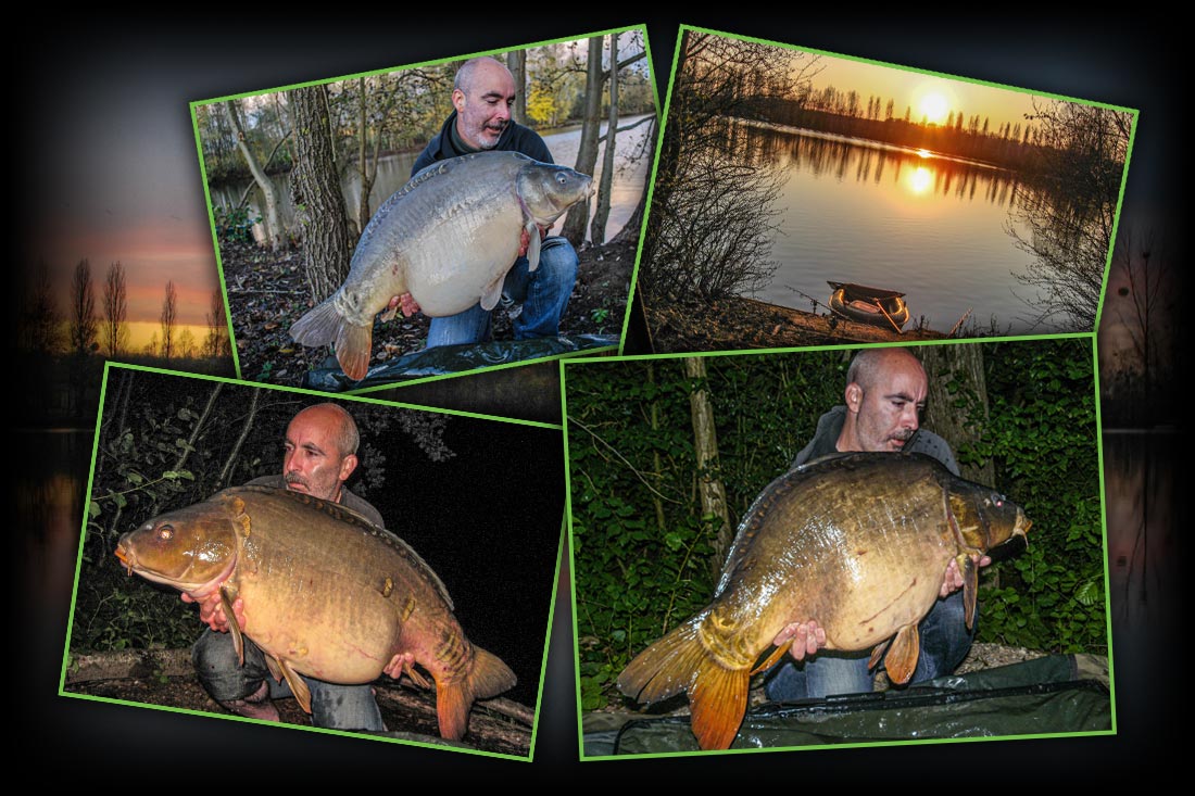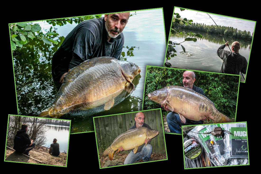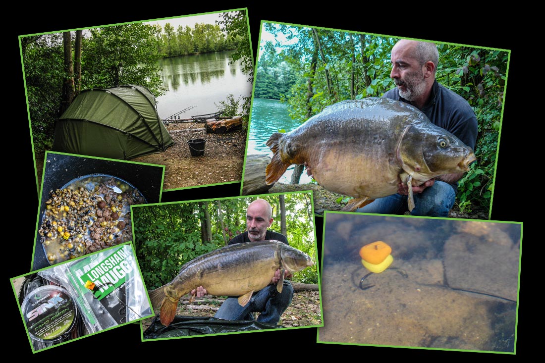 De rig zelf is eigenlijk heel simpel, een gecoate onderlijn materiaal, ik gebruikte toen sink skin van gardner en een longshank mugga haak en deze knopte ik blowback styl en op de hair fake mais van interprise tackle in de combo oranje/geel of oranje/wit dit was afhangend of het voorjaar of najaar was. Er was een duidelijk verschil en zeker ook welke plastic/fake baits want ze werkte niet allemaal, die van interprise tackle waren echt top terwijl andere merken minder waren!! Echt waar, zelf onder vonden. De rest van de set up was ook simpel, ik gebruikt bijna altijd inline drop off system (omdat dat de regel was) en leadcore om die laatste meter echt plat te hebben op de bodem. Omdat ik er redelijk veel viste was er een moment de mijn vis grief er gewoon bleef staan en dat ik voor een paar dagen of een week naar huis ging en dan weer terug kwam. Rob bracht me weg naar huis, en ik kwam terug met de TGV en hij of Andy pikte me op aan het station bij Disney land Parijs, dat was kort bij en zo ging heen en terug om de paar weken. De boeking liepen vlot en alles verliep heel goed en ik ving af en toe een goeie vis en daar ging het bij mij om in de tijd, genieten van wat ik deed en op welk water dat het was kon mij eigenlijk gestolen worden. De mensen waren goed voor mij tot daar op één of andere manier een einde aan kwam door jaloezie en back stabberij. Maar daar ga ik niet op in gaan omdat het eigenlijk al bij al 3 geweldige jaren vissen waren en met een paar enorm mooie vissen ook al zijn het betaalwater vissen. en mooie momenten mee gemaakt met toffe mensen.