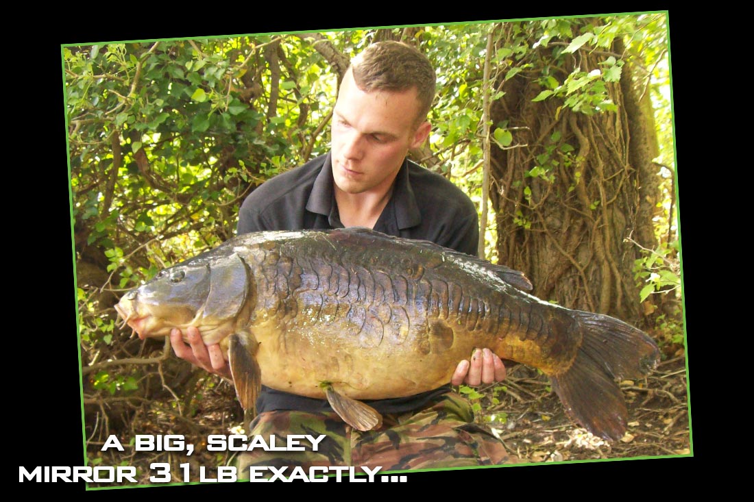 I had sat there quietly for another 5 minutes when the big shape started to move as the sun went behind a cloud, it came towards me and I saw her for the first time. It was a big, scaley mirror. My legs were hanging just above the water and I was just watching her come and have a look at my line, which was crudely placed on top of some lily pads; she even tried to mouth it to see what it was! Then she came right under my feet and my thoughts were how I would love to see her in my arms, as she really was a beautiful river carp. She carried on, moving onto my baited spot, and her head dropped, and she fed on the bait. My heart was pounding so fast, when suddenly she rocked back with a pink pop up hanging from her mouth, being blown in and out, but the hook was in. I don’t think she even know she was hooked, so I jumped up as quick as anything and then she bolted, and my reel went into melt down. Luckily, the fight was over quickly, as she didn’t know what had happened. I got her out and took photos and weighed her; 31lb exactly and I was over the moon. One target achieved.