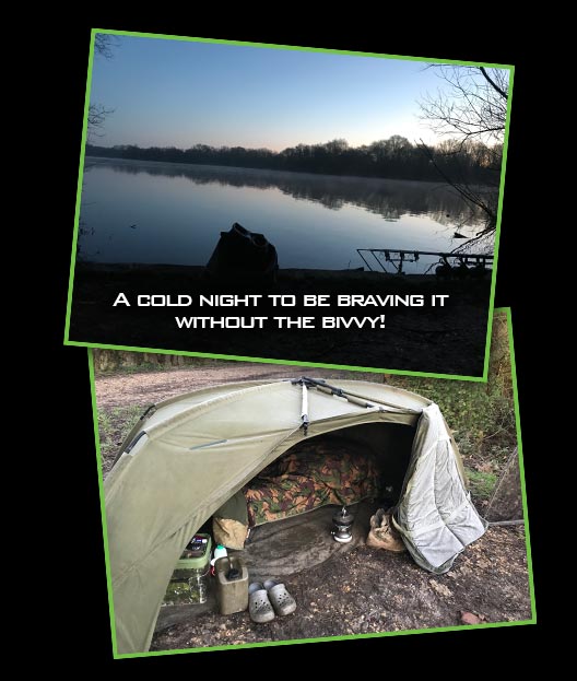 With a couple of night’s ahead of me, which is something I wouldn’t normally do at that time of year as it seems like an eternity with the amount of darkness you have to face, my enthusiasm was buoyed by the fish I’d seen the previous week. When I arrived just before dark, again the car park was a pleasing site, with only 3 cars in it. There was a stiff westerly coming across the face of the swim and conditions looked good, so I eagerly kept watch from the front of my bivvy, with the heater blasting away to make me think I was actually in my front room!