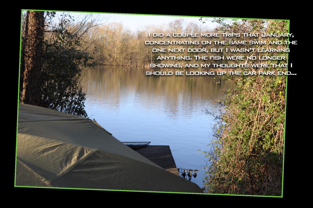 I did a couple more trips that January, concentrating on the same swim and the one next door, but I wasn’t learning anything. The fish were no longer showing, and my thoughts were that I should be looking up the car park end, as that is where the first bites were from early last year. The only problem with that end was, once a couple of fish came out, the angling pressure that it attracted would inevitably push them out.