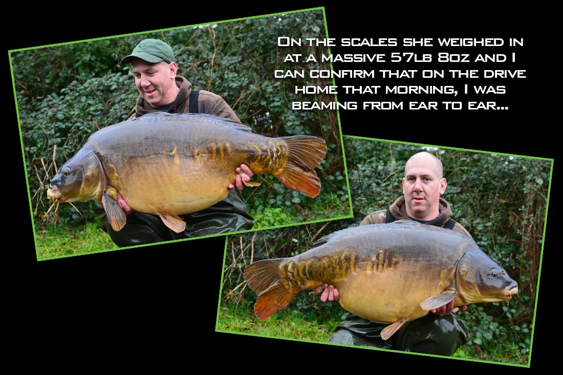 That capture bought my time on the pond to an end. As despite the lake containing some cracking fish, I had really only joined for that one fish. On the scales she weighed in at a massive 57lb 8oz and I can confirm that on the drive home that morning I was beaming from ear to ear. Later, I reflected on how lucky I had been with all the ‘ifs, buts’ and maybes’ but after the effort of getting there and moving it proved to be magical session and one that inspires me to keep at it, as they really can come when you least expect it!!