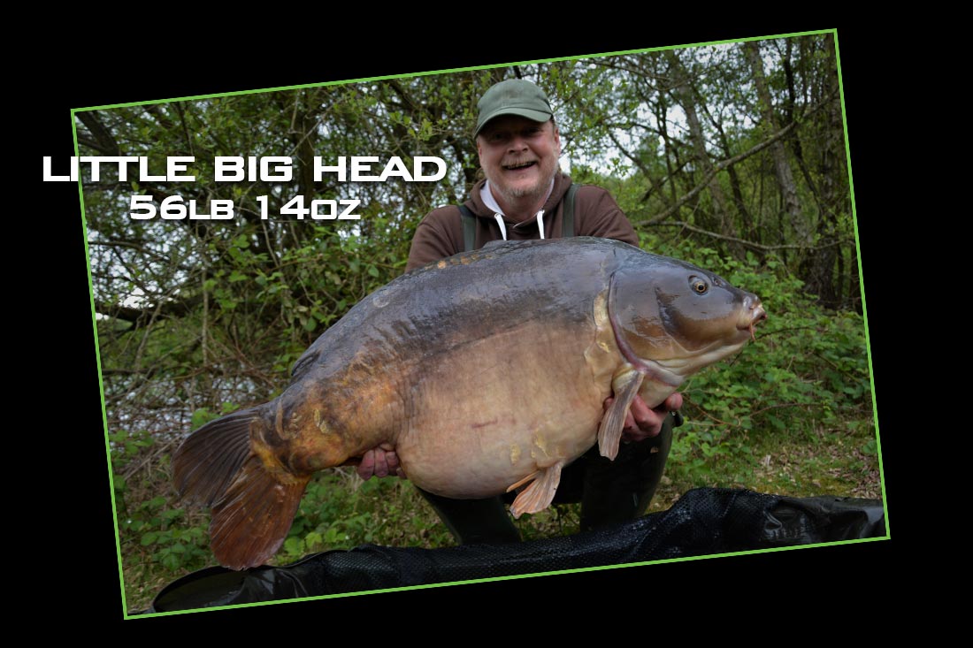 The next morning we headed off to the farm shop for a celebratory breakfast with a few of the other members and on our return I saw no reason to change anything so the rods went back on the same spots and we settled down for our second night. Now anyone that knows me will tell you that I am prone to the odd catastrophe, the occasional “how the hell did you do that?” moment, and this trip was to be no different. At around 3PM I had a take on the middle rod and a rather strange battle commenced with what was clearly a massive fish. About ten minutes in, the rig on my middle rod popped up attached to some line, a trailer I thought. I waded out into the lake to deal with it when Rob, sounding confused announced that that looked like my line too. He was right, it did! I asked him to pick up my island rod and it then became apparent that, once again, I had got myself into a bit of a predicament. I mentioned earlier that I was using back leads and what had happened, unbeknown to me, is that I had managed to slide the back lead into a submerged ball of brambles! The fish was actually on this rod, but because the back lead was jammed in the brambles it couldn’t take any line and had kited and picked up my middle rod which registered the take! As Rob frantically tried to untangle the mess the line parted, leaving me out in the pond hand lining an exceptionally large carp! I wrapped the line around my hand and slowly walked backwards, handing the line to Rob before going back out in the pond to do battle. This way I figured that if it did decide to go on a run, I would have some line to feed out from behind me and hopefully still be able to land it. Well it did go on a run, several in fact! I cut my fingers, burnt my hands but somehow, I was still connected. At one point the fish swam right in front of me and once again my legs turned to jelly. It was Little Big Head, another of the lakes big mirrors and another that was expected to be near the magical 60lb mark!