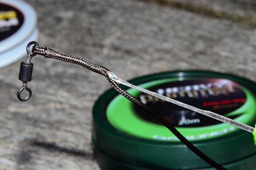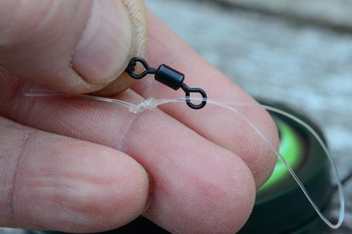 Step 5. Attach your lead to the weak link “loop to loop” style. The lead will stay well away from the carps mouth so it can’t bounce the hook out.