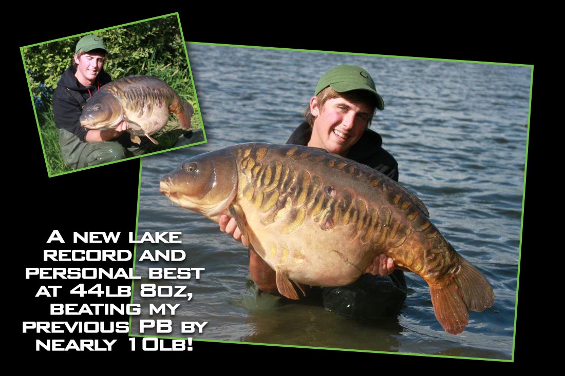 There was only one other angler on the lake, who happened to be the owner around the opposite side along the woods bank. So, after securing the fish safely in a retainer I gave him a call to see if he could assist with the weighing and pictures. He came over to help immediately and we set about weighing the fish, which was a new lake record and personal best at 44lb 8oz, beating my previous PB by nearly 10lb! After a few shots on the bank I got back into the water with the magnificent fish and posed one last time before letting her swim off. The lake owner congratulated me and left me to it, and I just sat staring at the lake for a while trying to take it all in.