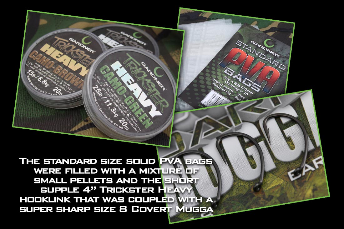 The standard size solid PVA bags were filled with a mixture of small pellets and the short supple 4” Trickster Heavy hooklink that was coupled with a super sharp size 8 Covert Mugga. My hook bait was a small piece of Peperami, that I had shaved the skin off and cut into a barrel to help it leak its delicious oily attraction. To boost things even further, the bag was loaded with good helping of fish oil. This would help me to identify if any fish were feeding over the bags from oil slicks popping up to the surface. Once the three bags were tied, it was just a simple case of casting them over the spots I had seen the fish show, before slackening everything off and sitting back to watch for the remainder of the day.