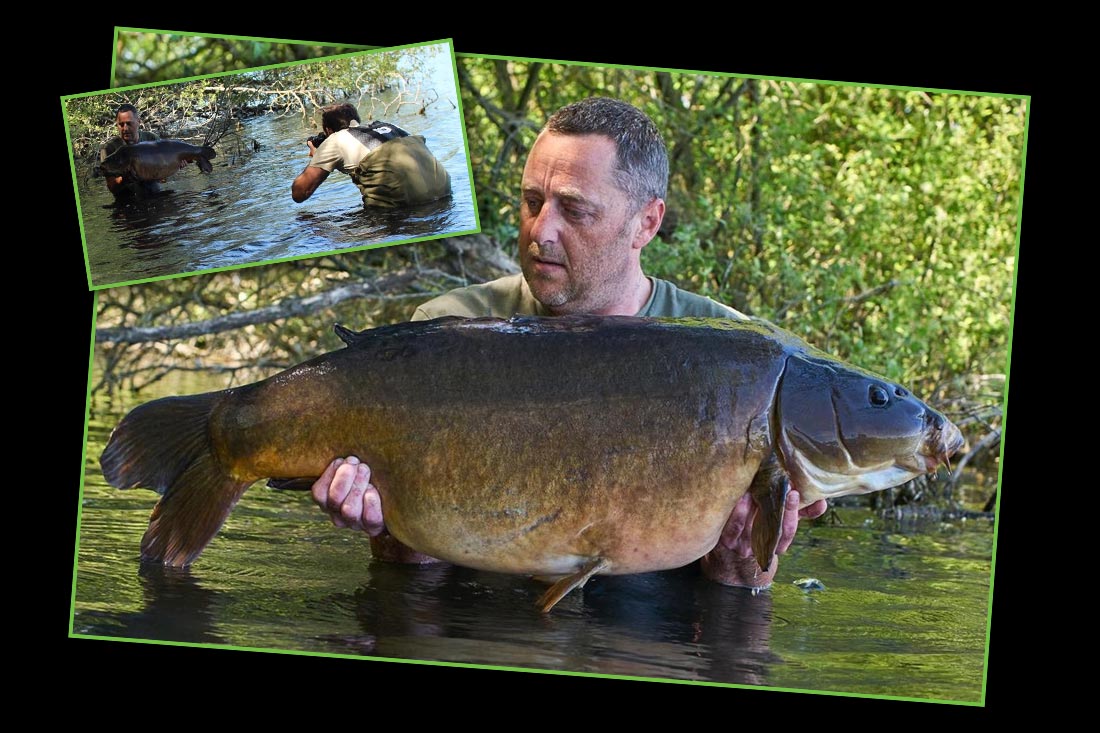 At 10AM the next morning, the middle rod pulled up tight and sounded the war cry; it was time to get the waders on sharpish. Straight away, I knew it was a good fish and it was now heading towards a buoy, so the brakes were put on and the fish steered towards the waiting net. I quickly waded back to the swim, rung a mate for assistance with some help but he was miles away. I had a look in the net whilst talking to him and he asked, “which fish is it?”. I looked again, and I was a bit gutted as I thought it was The Long Fish. In fact, I very nearly unhooked it and let it straight out the net as it would have been a repeat. As I was doing this I explained to him and he said “check the dorsal”, and as I looked I soon realised it was the Big Leather which without doubt as good (and some say better) than the Baby Black, and it was bigger than I had ever seen it!