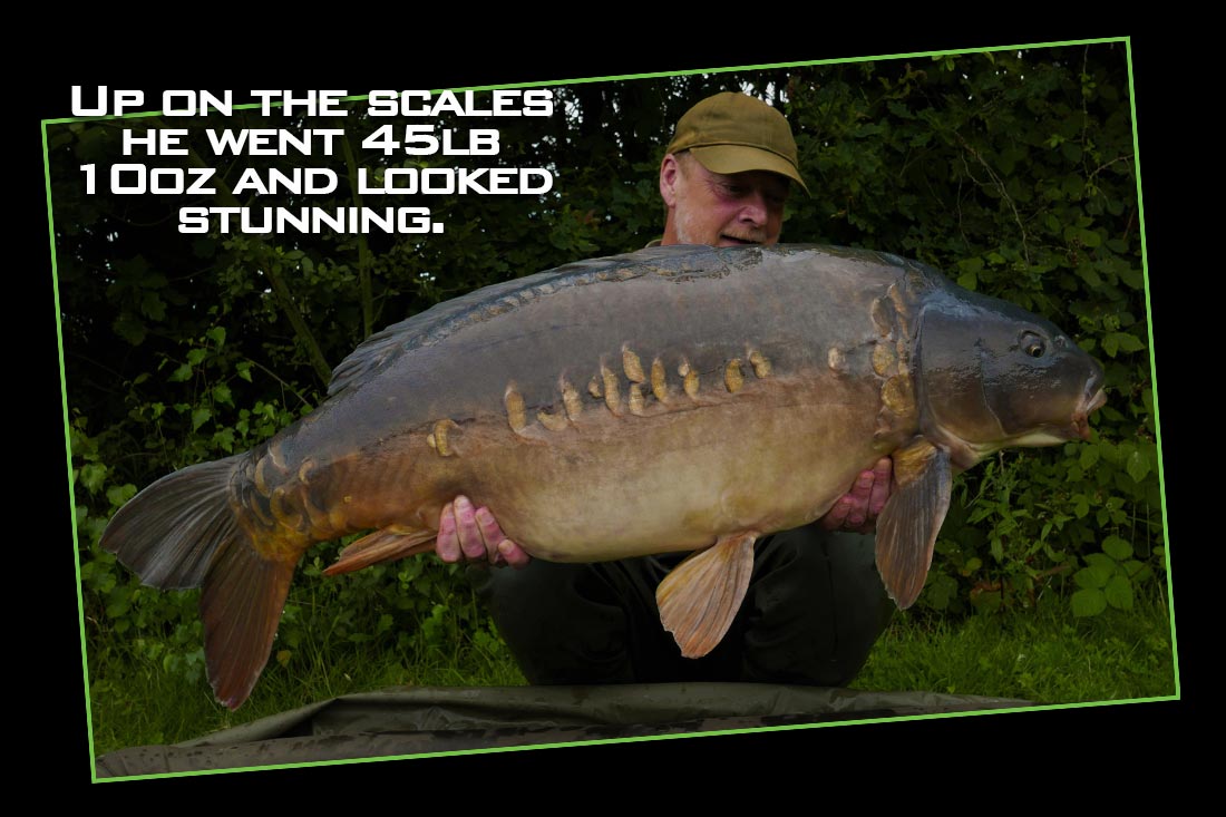 A short while later he slipped in the net and indeed, he did look massive! Up on the scales he went 45lb 10oz and looked stunning. He was also a new lake record. Later that night I had another 34lb mirror.