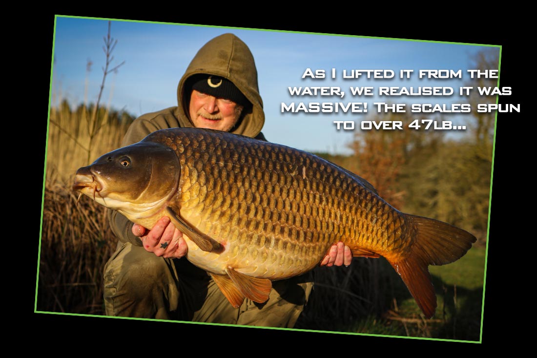 As I lifted it from the water, we realised it was MASSIVE! The scales spun to over 47lb and we were both gobsmacked! I had permission to retain the fish for the purpose of the article, so after getting her settled in the margins it was back to bed.