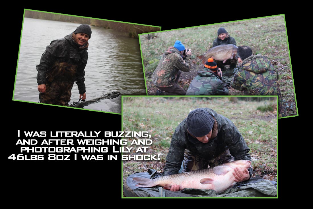 During the latter part of the fight I could see it was a big common, so just let the rod do the work and netted the fish when it was good and ready. This all went to plan and as text-book as it sounds, there in the bottom of my net laid Lily. Now, over the last year, I’d caught 4 other fish over 45lb and 3 of them had been repeat captures, all whilst trying to catch Lily or Gregory. Although they are still big fish they don’t necessarily mean as much as a new one and a target. I was literally buzzing, and after weighing and photographing Lily at 46lbs 8oz I was in shock! In fact, I was that much in shock I nearly rung Wayne up to tell him how he was right about where I’d catch her from… Well, we celebrated that capture with tea and ginger nuts, I even threw one in the lake for Wayne.
