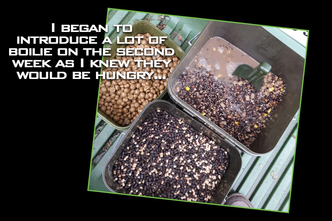 The first bait up I gave them was a big hit of seed and pellet. Then, every other day for the next two weeks, I was going down after work and giving them another bucket. I began to introduce a lot of boilie on the second week as I knew they would be hungry. CC Moore Odyssey XXX as this bait had caught well on there in previous years. I went through more bait in this short period of time than I had used in the whole of last year!