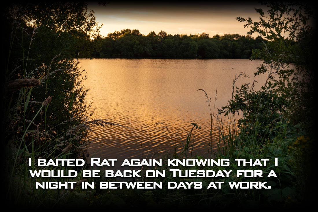 Tuesday came around and I just couldn’t wait for that clock to hit 5.30PM so I could get back down to the lake. After pulling into Snails Lane and finding no cars or vans in the car park, you could imagine how I was feeling. The rods went out perfectly that night and I sat back with a couple of ciders and took it all in. My first night in Rat, after all that effort, was it going to pay off?