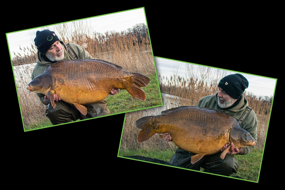 Maar ik had men fix nodig. Ik moest en zou vissen, dus het weekend ertussen ging ik twee nachten doen en de keuze was op ‘de diepe zand put’ gelijk ik al besloten had eind december ‘op de put’ men winter te vissen en wie weet ook in het voorjaar. Het zal geen gemakkelijke opgave worden, maar ik vis graag in de winter en had men zinnen erop gezet. Vrijdag 22 Januari rond de voormiddag was ik er en besloot om terug de stek te bevissen waar ik in December die mooie spiegel ving. Ik wist dus wat me te doen stond, in de richting van het riet of in het dip, in de bomenlijn gooien en een 7-tal medium spombs volgde. Ik had thuis al men aas al klaar gemaakt, een paar handjes 15mm bollen, veel boilies kruim (gemalen bollen) hemp, tijgers en wat mais dat allemaal over goten met liquids en een paar extra powders zoals liver powder. Een zalige winter mix met heel veel attractie (oh ja ook nog pellets in de mix gedaan) maar niet veel vast voedsel. Rond 12u lagen alle 3 de hengels in, linker en middel hengel met korte ronnie rigs en de rechter hengel met een muliti hinged stiff rig (de rig waar ik in het najaar van 2020 95% van men vissen op ving) maar de korte ronnie werd ook ingezet. Kort dan bedoel ik een 10cm of 4inch boom en voor de rest hetzelfde als altijd voor het maken van een ronnie rig. Een maat 6 conti mugga haak, een hook stop, een micro hook ring swivel, QC of ronnie rig swivel en wat krimpkous en daarop de krimpkous een beetje putti om het zaakje te verankeren op de bodem. Er werd gekozen voor met orange tutti pop-ups te vissen. Alle rigs gingen te water en de donk, melden dat ze perfect lagen!! Het wachten kon beginnen. Het was eigenlijk mild voor de tijd van het jaar en eigenlijk had ik wel vertrouwen. Ook al was het tussen twee maan phases (Volle en nieuwe maan). Er werd steeds over men lijnen gedoken door een paar meerkoeten en af en toe raakte die de lijnen. Zo doken niet op de voerstek maar ze doken op het talut waar nog wier staat. Iets voor 16u was dit weer het geval en de hanger op de middel hengel was wat gezakt. Ik wil die terug op zen plaats hangen (strakke lijnen) en een bleep, en nog een bleep en ik kijk naar de strakke lijn en ineens trekt de lijn uit de clip. Op dat moment besef ik dat ik een aanbeet heb. Een trage aanbeet, een winter aanbeet. Ik neem dus de hengel vast en draai strak op de vis! En ik voel weerstand en voelde redelijk wat gewicht. Je voelt dat gewoon. De vis zwemt eerst naar rechts en komt al vrij snel nog redelijk op afstand aan de oppervlakte en duikt dan terug de diepte in naar links. Ik voel nu dat het om een goeie vis ging en alles verliep vlekkeloos. Na 10min kan ik toch wel een imposante vis het net in loodsen. Ik kijk in het net en denk bij mezelf FUCK das een heel goeie!! Dus even in het net laten in de kant en de weegschaal en mat wat dichter bij brengen. Ik leg de vis op de mat en doe het schepnet ervan onder en zie dan om welke vis het gaat!! Holy fuck het is ‘De Ketting’!! Alles verloopt nu in een roes van euforie. Ik leg de vis even in de sling te water om alles gereed te zetten, om foto’s te nemen. Mat, statief, camera erop en afstand bepalen en de ingebouwde functies instellen (elke 4sec een foto, dat zoveel je wil). Ik haal de vis uit het water en breng hem naar de mat waar we samen poseren voor de fot. Hij gedraagt zich uitstekend en dus de foto shoot verloopt vlot zodat ik hem ook vlug kan terugzetten. En de vis krachtig zie wegzwemmen!! Jammer genoeg geen water shots en filmbeelden (recordknop vergeten in te drukken). Maar who cares, ik ving net ‘a fish of a life time’, en de rest is bijzaak. Ik weet uit ervaring dat ik geweldige self takes heb van deze vis. Een nieuw Belgisch PB voor mij, en als voetnoot toch even vermelden dat hij op zen topgewicht ooit zat en dat het één van de moeilijkste vissen van het water was. Dit alles maakt deze vangst nog specialer en dat het om de vis gaat die bij mij echt bovenaan men verlanglijstje stond om op dit water te vangen.
