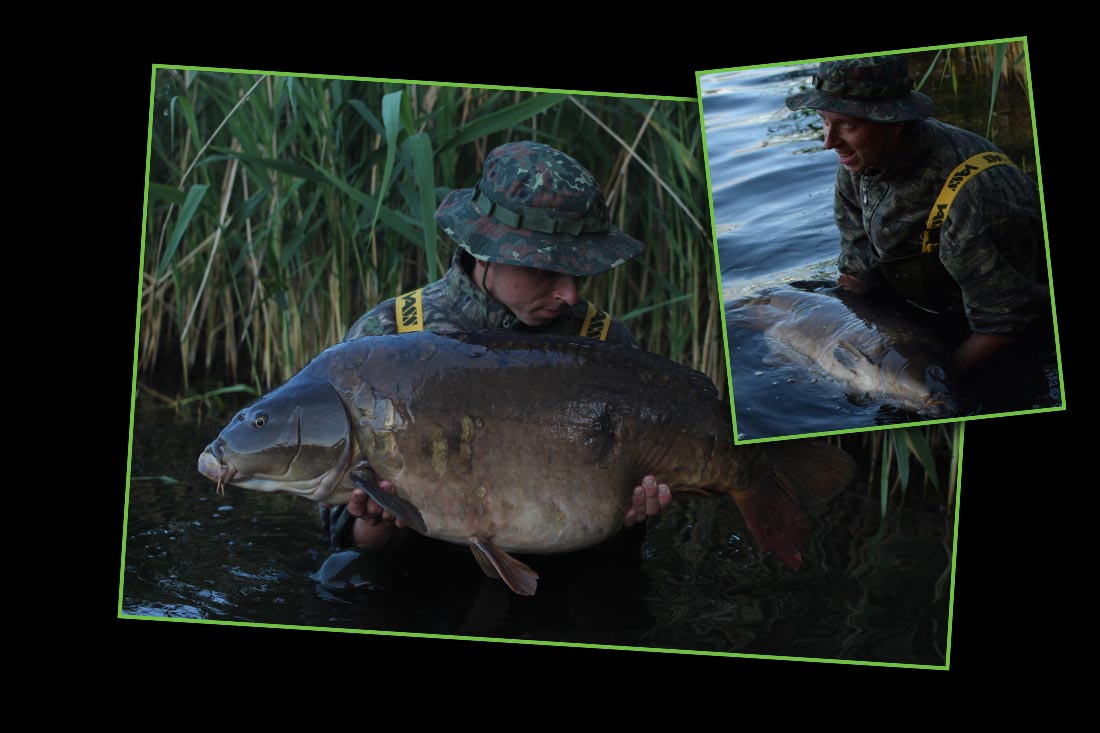 The following season I used the knowledge I had built up from the previous year and I targeted the more productive areas of the lake that I had learnt about. I was constantly learning along the way and during the autumn I had a few more fish with some wicked upper double scaleys and a chunky 30lb mirror. There was one morning in particular I will remember for a very long. I woke to an absolute ripper of a take at first light. With real thick mist rolling across the lake, I was barely able to see my rods, which where ten yards out in the lake. I scrambled out of bed to get the waders on and ran out into the lake. After a short battle a mega old scaley mirror was recovering in the net and only 10 minutes later she was joined with a 30lb 14oz mirror. What a magical sight that was!