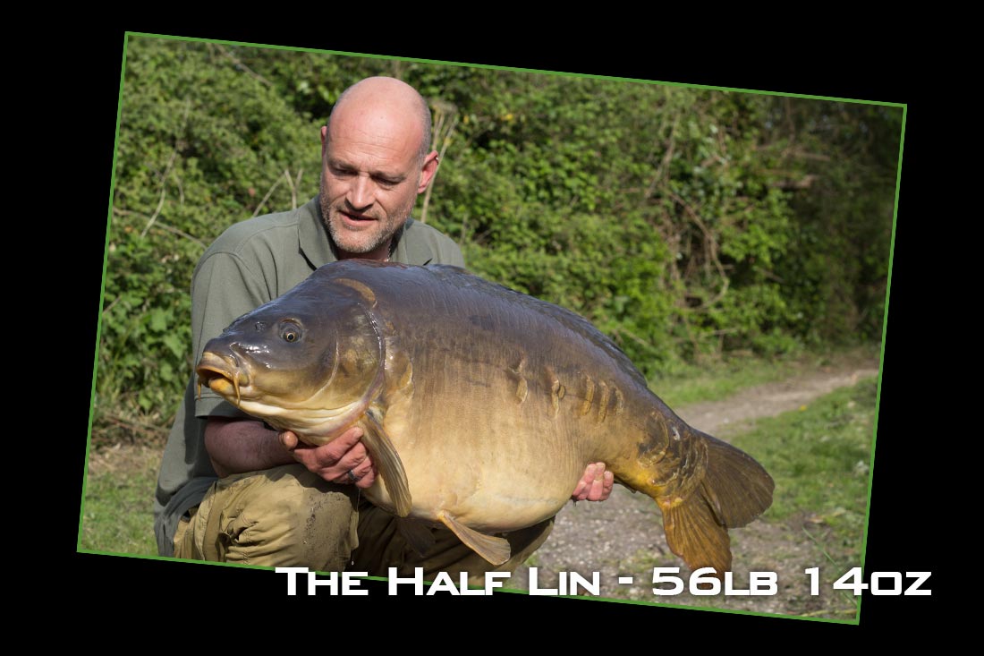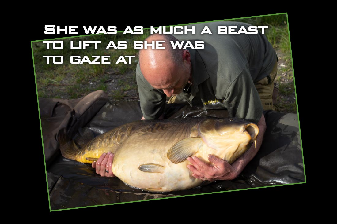 Out of the water the Half Lin looked immense. A true giant of a carp the like of which I hadn’t seen before. I needn’t have worried about the hook pulling as the hold was damn near perfect and her mouth was testament to the good handling that she had received upon previous captures. She was as much a beast to lift as she was to gaze at. Mind you, at 56lb 14oz she would be. I think only one or two shots were reeled off before I had to bring my knees into play to support her weight.