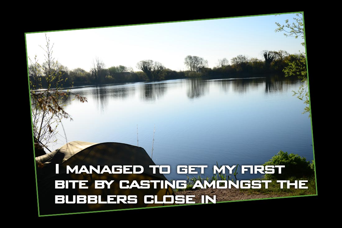 It was also hugely revealing in terms of how the carp behaved and what the other syndicate members were doing. The standard of angler was impressive and I was keen to find an edge. Although I saw plenty of afternoon shows at range in open water they were pretty random in respect of which part of the lake they were in. Quite a few were double shows, the same fish breaching the surface twice in quick succession, which gave me the impression that they were cleaning off and it was pretty clear to me that they weren’t necessarily showing where they fed. They were feeding though; just not where they were jumping as there was bubbling going on close in, both in my swim and the corner next door. I managed to hook one by casting in amongst the jacuzzi but alas it fell off not long after I’d picked up the rod. Obviously it was encouraging to have a bite on my first attempt and, thankfully, it didn’t felt particularly special but I wasn’t best pleased to have fluffed my first chance.