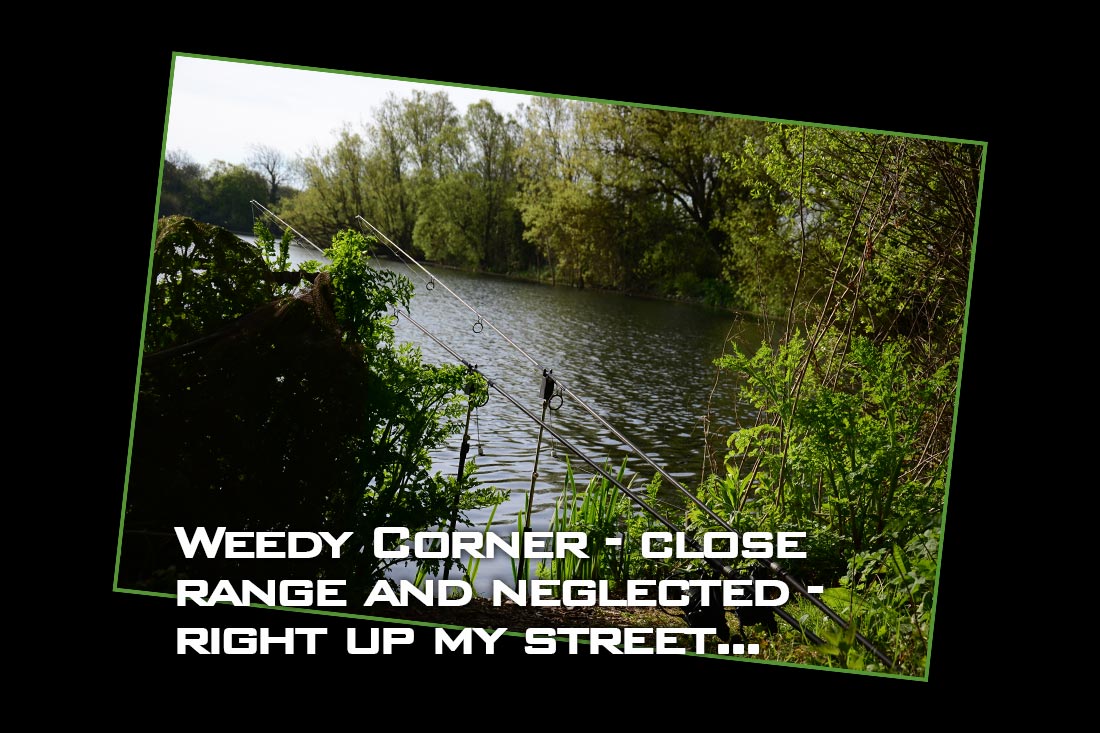 From my perch, high in the branches, I gained a good bit of knowledge and, as the wind abated, I was able to make out the shape of the clear area around twenty yards out. Surrounded by weed it was like, I suppose, a teardrop shaped doughnut with a weedy spot right in the middle, running across the swim. At the point there was a gap in the weed which the carp were using to enter the feeding area.