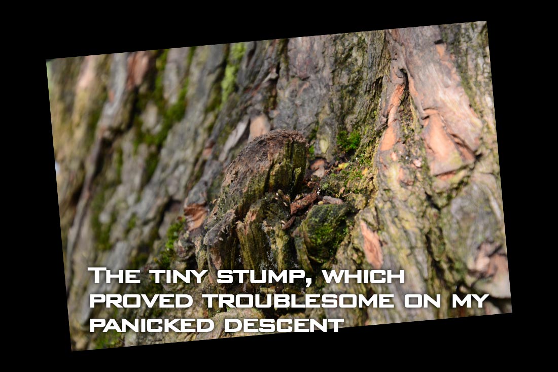 There was another good spotting tree in the swim, but it wasn’t the easiest of climbs. It was only made possible by a tiny stump from a long ago snapped off branch, albeit with a tricky descent, as it was necessary to swap feet on this miniature peg. Nevertheless I shot up to ascertain the situation for myself.