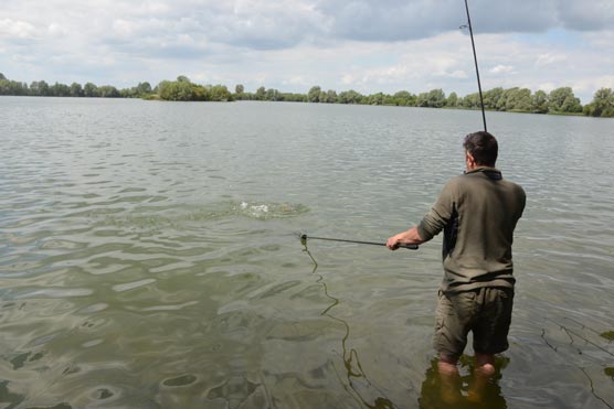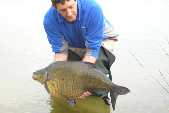Not unexpectedly, the rest of the evening was quiet but a little after midnight a 14lb 6oz fish signalled they had returned. I was back in business and the bream were even good enough to let me sleep until well past dawn when I was woken by a 15lb 4oz fish. Mid-morning came and James Crameri arrived for a chat. As I pegged the side of my bivvy back so I could talk to him whilst sat inside, I heard an alarm sound and thought I or James had knocked the rod, but it was a bite and soon James was photographing a 13lb 13oz bream for me. I paddled out again and on returning told James that it might sound strange, but I really thought I was going to catch a really big bream on the rod I had just recast. I was wrong though, as the next bite came on the rod I’d recast after the ‘15’. As it came towards me it felt heavy, but we’ve all been fooled like that. Closer in though it just held a line beyond the marginal shelf refusing to come to the net like the earlier fish had. Eventually I waded as far as I could and managed to draw it over the net with James recording it on my camera which had been lying on my bedchair from the earlier catch shot.