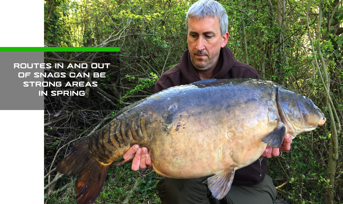 Snags are a carp magnet in spring, and always the first place I look when arriving at a lake. One place I used to fish was so predictable in where I would first see fish after the winter. One bank was full of overhanging branches and woodwork, and without fail it was the first place I would find them. It was like the flicking of a switch too, one day I would go there, usually early March, and see nothing, but a couple of days later, with no change in the weather or conditions, and they’d be there, cruising in and out of the submerged branches, often covered in clay, clearly active and catchable.