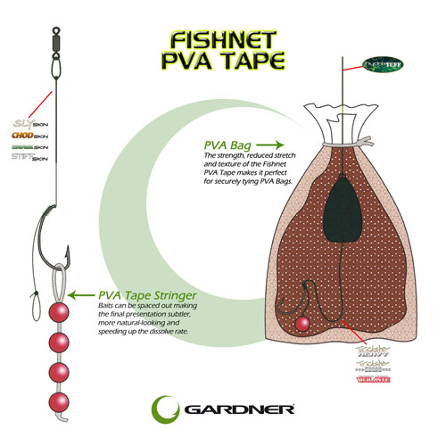 Back by popular demand! Fishnet PVA Tape is a 2.5mm wide woven PVA thread with a flat, wider profile making it the strongest of our PVA string range. This means it is the number one choice for anglers wanting to minimise the PVA used on their terminal tackle.